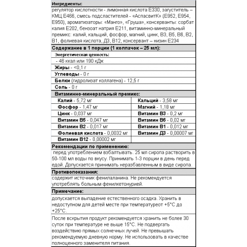 подготовленная питьевая вода, гидролизат коллагена, регулятор кислотности - лимонная кислота E330, загуститель – КМЦ Е466, смесь подсластителей - «АспасвитК» (Е952, Е954, Е950), ароматизаторы: «Манго», «Груша», консерванты: сорбат калия Е202, бензоат натрия Е211, витаминно-минеральный премикс: калий, кальций, фосфор, магний, цинк, В3, В5, В6, В2, В1, фолиевая кислота, Д3, В12, консервант – низин Е234