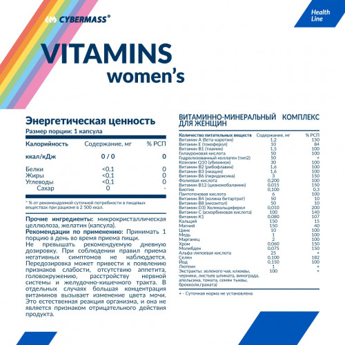 индивидуальная непереносимость компонентов продукта.Vitamins Womens от Cybermass — комплекс витаминов, минералов, органических кислот и растительных экстрактов, разработанный и подобранный специально под нужды женского организма.