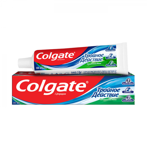 Зубная паста Colgate Тройное Действие обеспечивает максимальную защиту от кариеса. Эта трехцветная зубная паста оказывает тройное действие: помогает защищать зубы от кариеса, помогает удалять потемнения с поверхности зубов и освежает дыхание. Что немаловажно, Colgate Тройное Действие обладает приятным мятным вкусом!